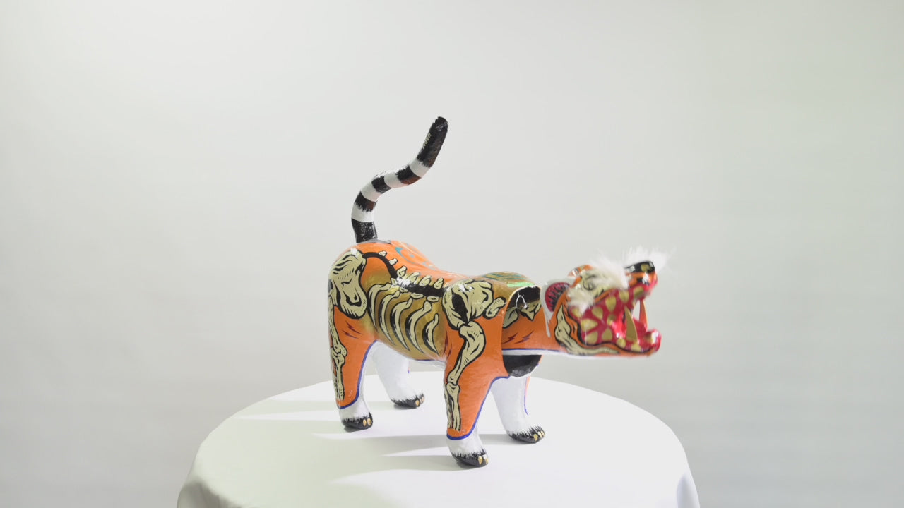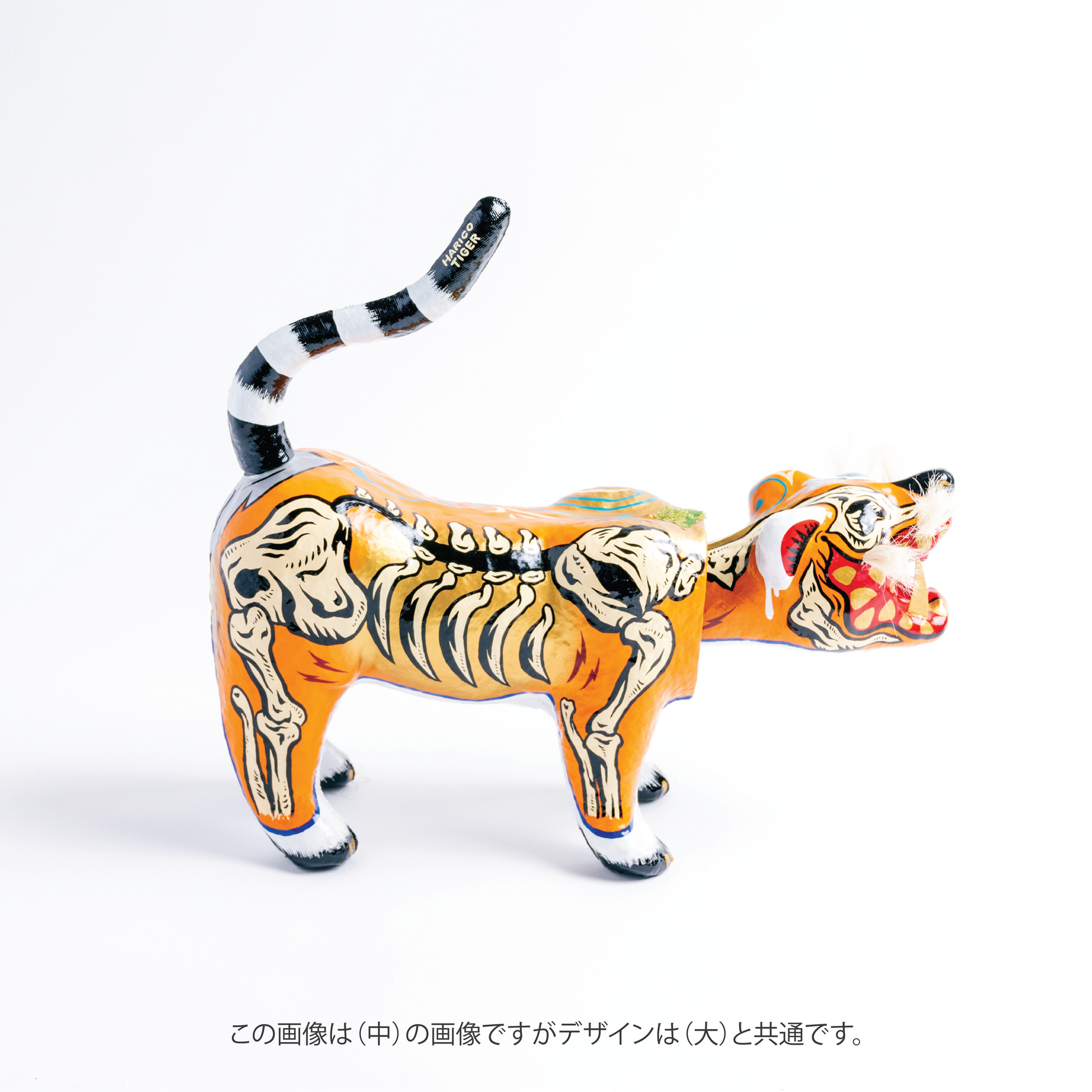 橙は子孫繁栄の願いを込められた色で、古来からの虎の張り子に込められた願いと共通のものです。左右異なるデザインで一方は虎の骨格、一方は虎の毛並みをラインで表現しポップな表情を持たせました。